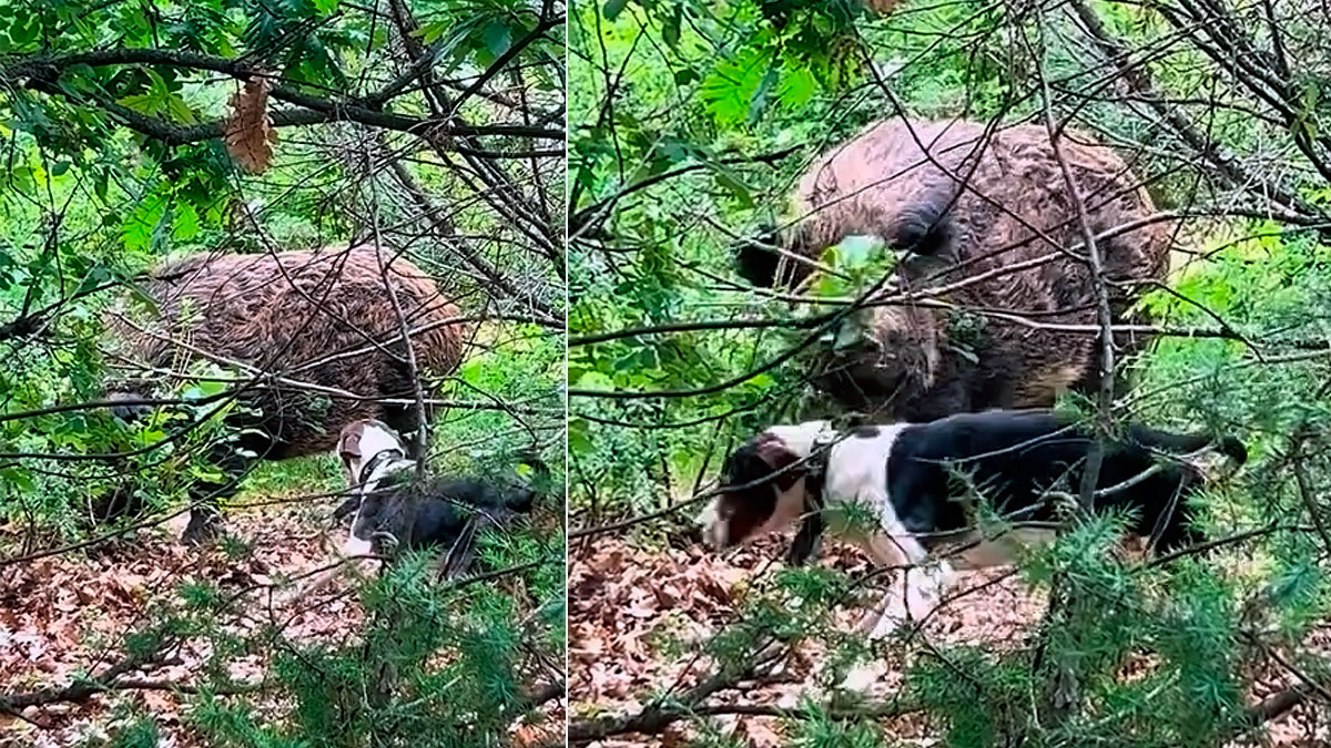 Un perro de caza se enfrenta a un jabalí de tamaño monstruoso