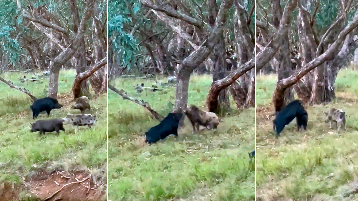 La publicación realizada por la página de Facebook Reels, Ruts & Nuts, especializada en la caza en el continente australiano, muestra como varios machos de grandes dimensiones intentan copular con una cochina. Dos de los ejemplares se enzarzan en una cruenta batalla por reproducirse. Otro macho que se encuentra en la zona intenta aprovechar la confusión para montar a la hembra. Tras unos segundos de intensa lucha uno de los contrincantes se rinde y permite a su rival cubrir a la cochina.