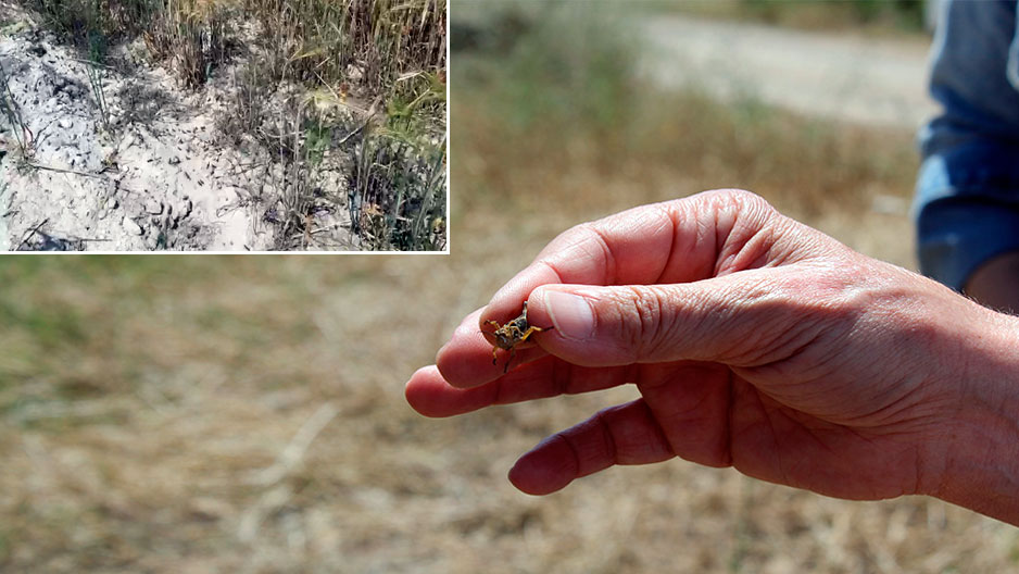 Los expertos del Gobierno de Aragón durante el reconocimiento de la zona afectada por las langostas.