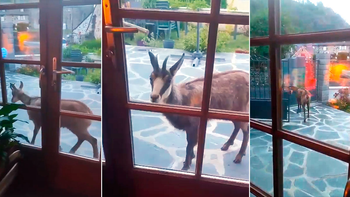 Un precioso ejemplar de rebeco se detiene frente a la puerta de una vivienda de Cantal. Ha entrado en la propiedad a través de su patio por la cancela entreabierta. Tras observar a través de los cristales y dejar a su propietaria grabar el momento, se aleja y sale por el mismo sitio por el que entró.