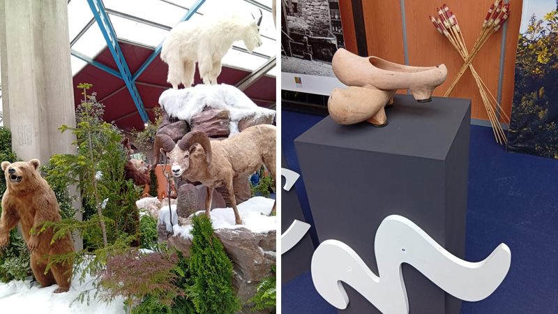 Exposición del doctor Romero Nieto. A la derecha, Turismo presentó sus tradiciones como las madreñas de los ganaderos. Hoy todavía en uso.