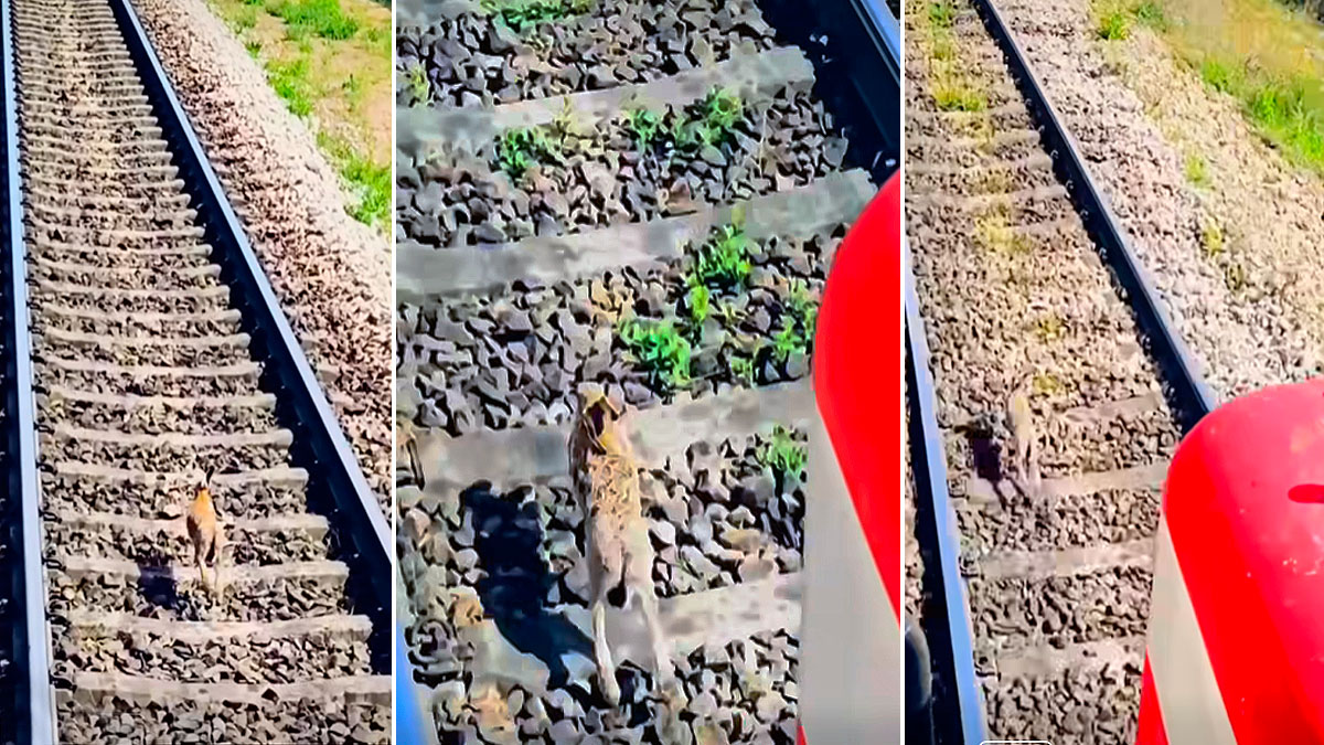 La rabona aguanta varias decenas de metros el ritmo del ferrocarril. Ante la terquedad de la orejona, al maquinista no le queda más remedio que detener la marcha del convoy para no atropellarla.
