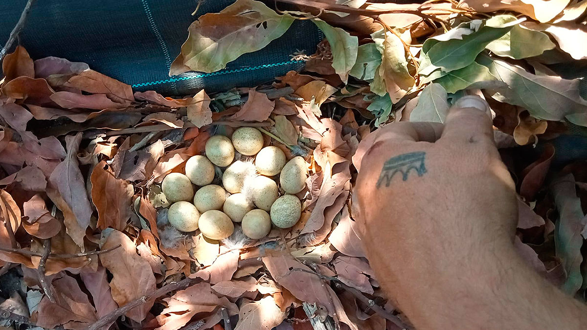 En esta ocasión a esta pájara no le ha quedado más remedio que poner los huevos sin la protección de cubierta vegetal al estar arado el suelo de la plantación de aguacates. En la tierra únicamente hay hojas secas y pequeñas ramas de la poda de los árboles. El nido ha sido encontrado por un colaborador habitual de Club de Caza en la provincia de Cádiz. Realizó el hallazgo mientras ejecutaba tareas agrícolas.