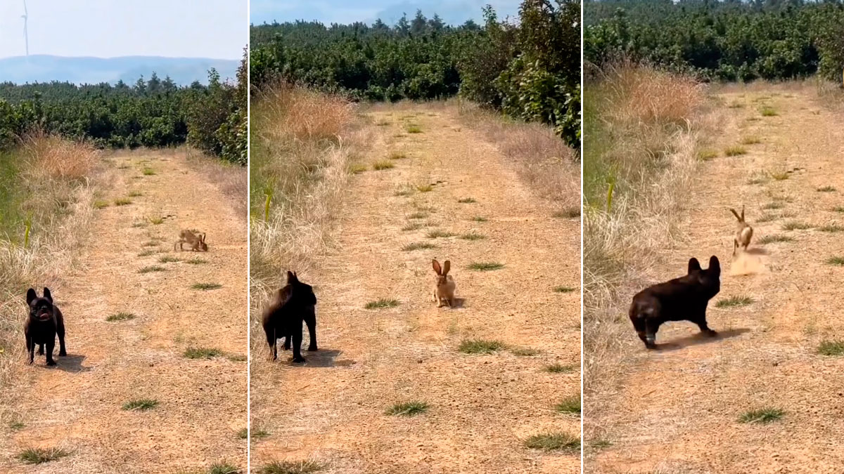 Un ejemplar de la raza bulldog francés recupera el aliento en un camino rural, ajeno a que una liebre se acerca por detrás. Lo más llamativo es que esta no se da cuenta de que casi pasa por encima del can hasta el último momento.