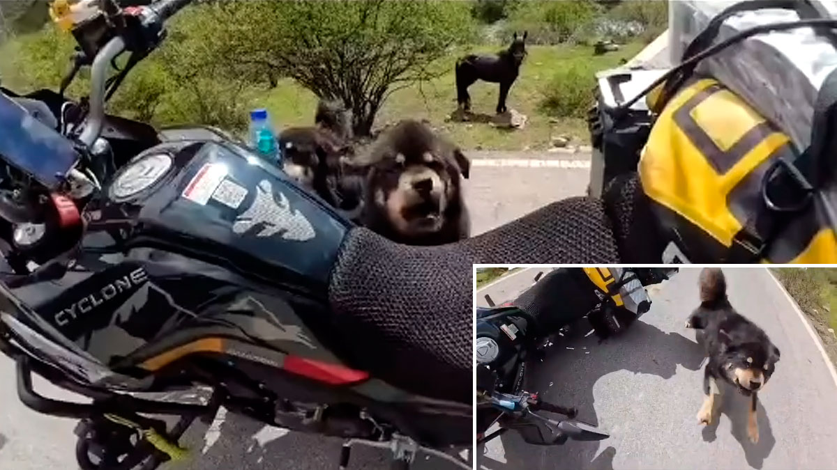 El conductor detiene la moto y pone la pata de cabra para asegurarla, usando el vehículo de escudo ante la carrera de este y otros perros que hay en las inmediaciones. De poco le sirve, por la agresividad de los animales les lleva a tirar la moto al suelo y llegar así hasta él para atacarle. El perro que encabeza la agresión es un mastín tibetano, una de las razas más fuertes y respetadas en todo el mundo cuando se trata de proteger propiedades o ganado.