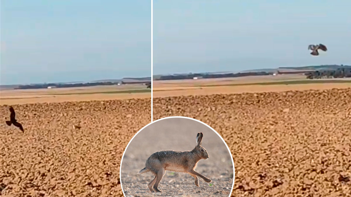 La rapaz aprovecha que un agricultor levanta del encame a la rabona para lanzar un fulgurante ataque. La orejona esquiva las acometidas del depredador y logra huir.