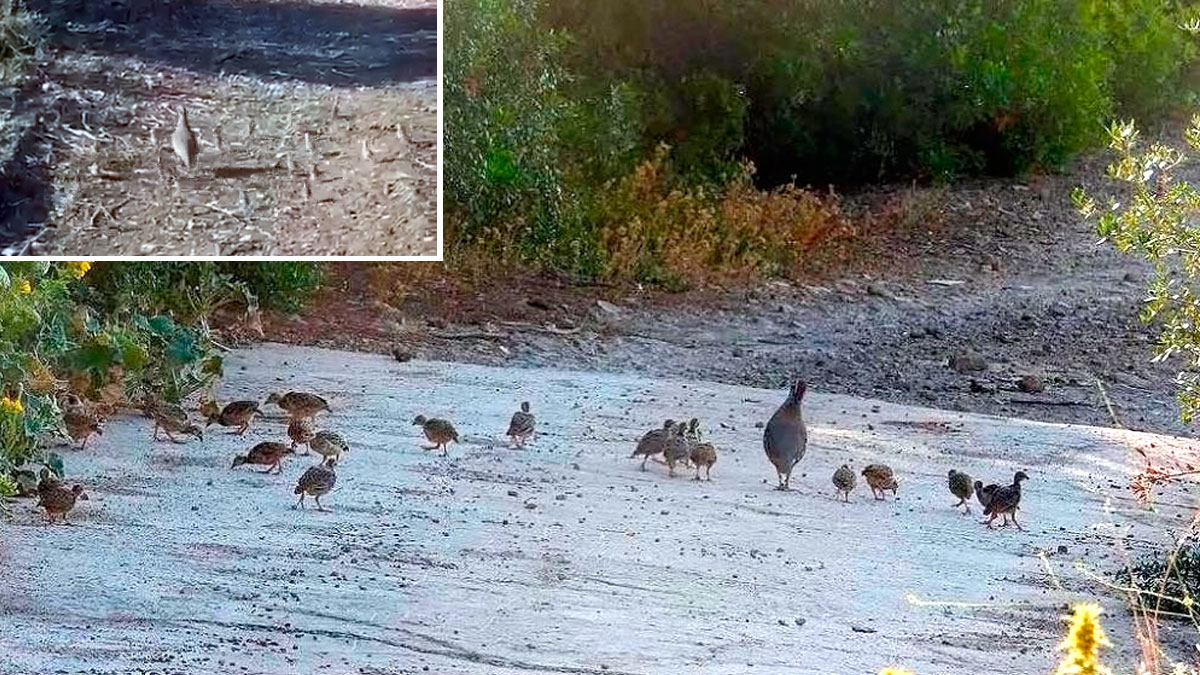 En la grabación podemos ver como dos hembras acompañadas de pollos son descubiertas por el gaditano en una pista de tierra. Mientras que la primera madre, seguida de pollos,se aparta rápidamente del camino, la otra pájara avanza con un ‘incontable’ número de perdigones por la zona sin vegetación.