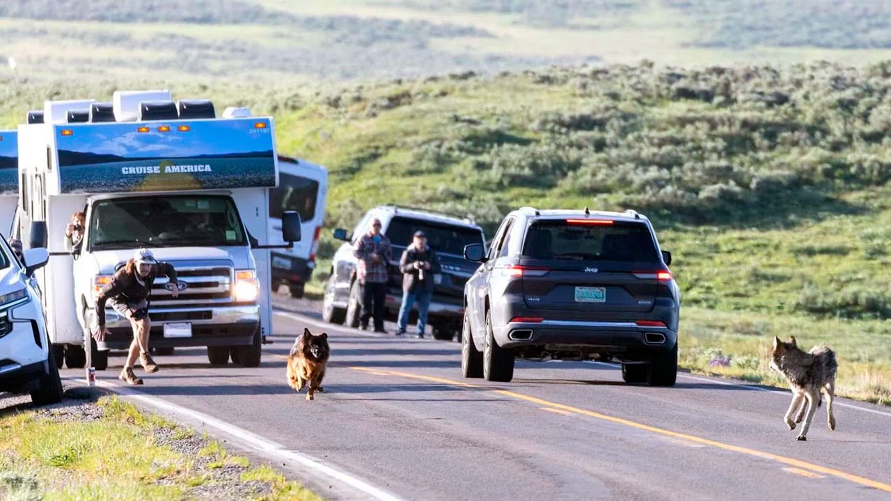 Un pastor alemán salta de un vehículo y persigue a un gran lobo en Yellowstone