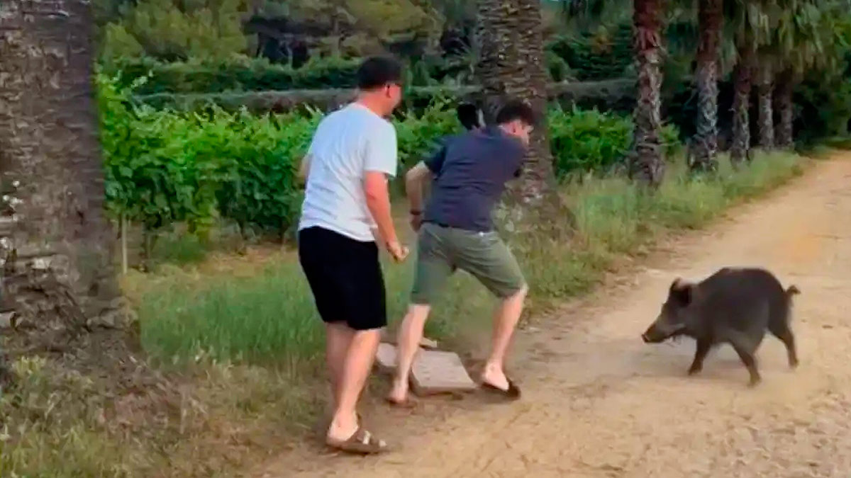 Se escuchan las carcajadas de algunos de los que corren para alejarse de los animales. Dos varones corren, pero en dirección contraria para intentar salvar la cena. Las pizzas aún están en sus cajas, pero los cochinos se empeñan en sacarlas de allí para devorar eso que les huele tan bien.