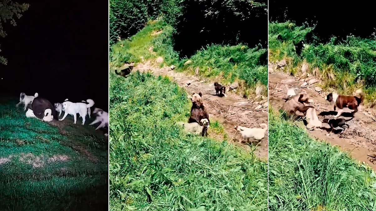 El pastor ilumina al rebaño, compuesto por ovejas y algún burro, y descubre al oso en pleno ataque. Ha conseguido atrapar a una de ellas, y los perros ya le han encimado, pero el depredador no suelta a su presa. Solo la cercanía del pastor le lleva a abandonar a la oveja. Pero el acoso de los perros acaba con uno de ellos gravemente herido. A pesar de las terribles imágenes, el pastor asegura que el kangal turco sobrevivió y lo muestra en un vídeo posterior de su canal de YouTube.