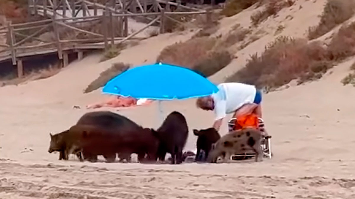 Un turista intenta salvar la mochila y las bolsas con comida que ha llevado a la playa. Pero no lo tiene fácil. Nueve jabalíes intentan robarle todo.