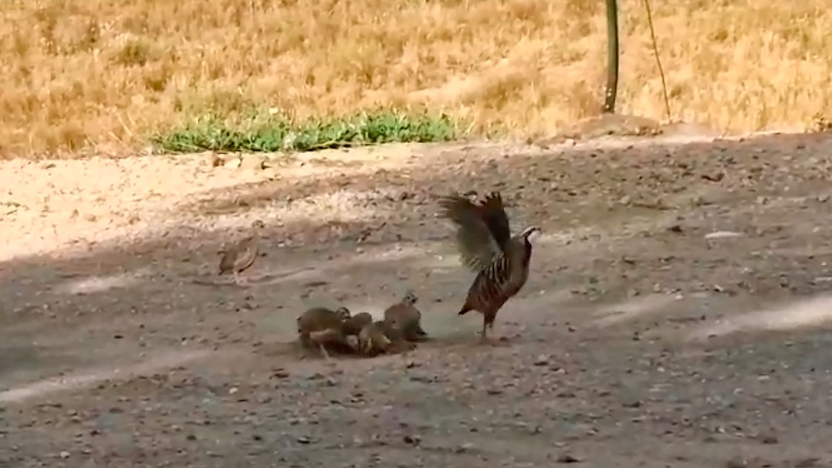 Madre de perdices rojas: una nidada de perdigones se da un baño de tierra frente a una guarda rural de vocación de 78 años