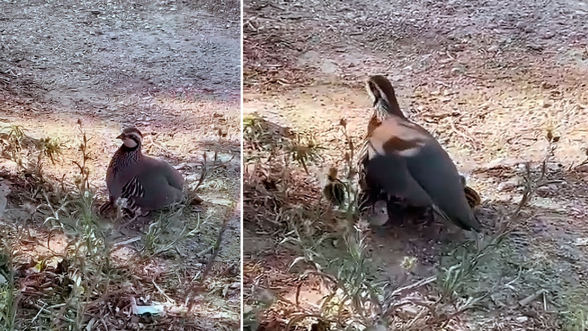 Una perdiz roja esconde a una decena de perdigones bajo su plumaje para protegerlos