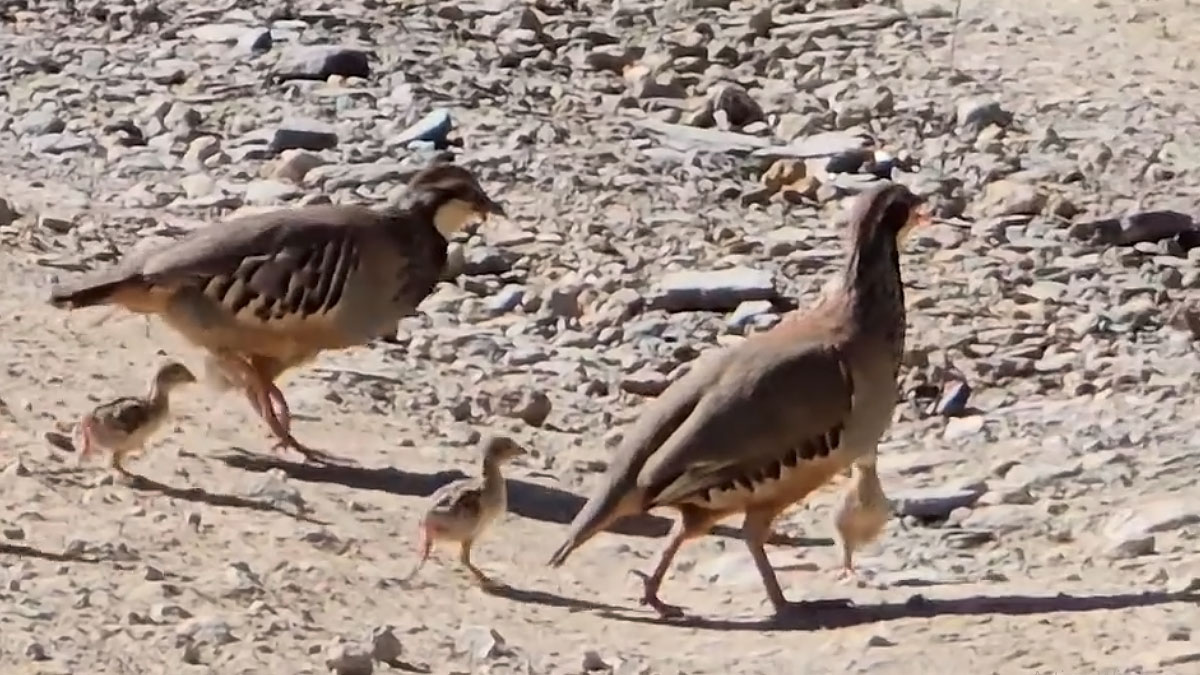 El conflicto motiva que los pollos de ambos bandos se desperdiguen. Las dos hembras abandonan la vegetación y tratan de reunir a sus perdigones en el carril de tierra. En la pista vuelve a arremeter contra su inesperado oponente. Este evita el conflicto y se aleja del lugar acompañada de los polluelos.