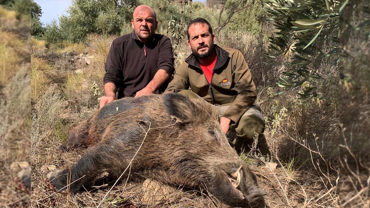 El buen hacer de los canes permitió a Germán abatir este impresionante ejemplar. Junto a este macareno se cazaron cinco cochinos más, entre ellos uno medalla de bronce y un gigantesco animal de 120 kilos cazado por Antonio.