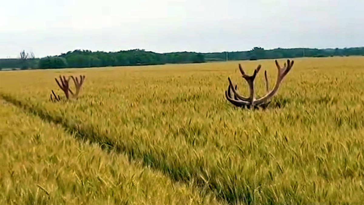 Los dos majestuosos ciervos son grabados en un cultivo en el que el grano está a punto de ser recolectado. En España son muchos los agricultores que sufren la superpoblación de ciervos que ha provocado en algunas zonas la prohibición de la caza en los parques nacionales.