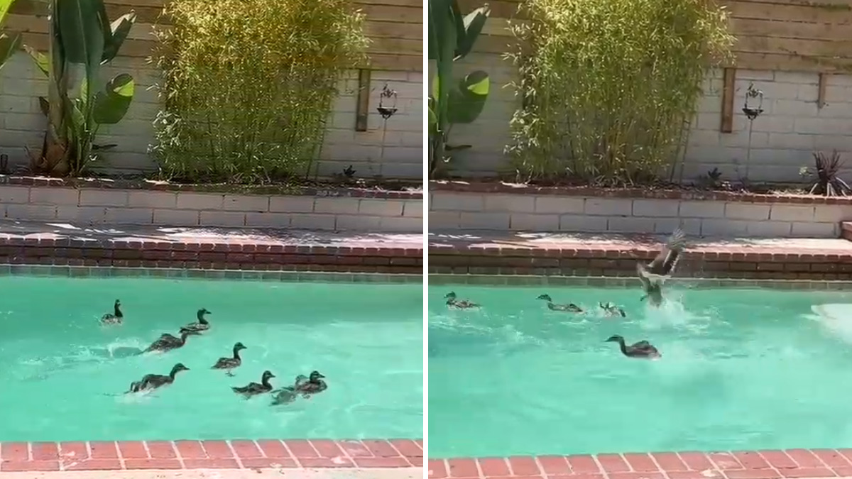 Una bandada de patos se da un chapuzón en la piscina de un chalet