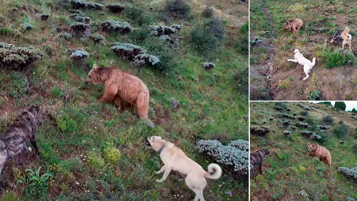 El espectacular encuentro se ha producido en plena naturaleza de uno de los países con más ataques a sus animales domésticos por parte de depredadores. Este ganadero turco ha aprendido las estrategias de úrsidos y cánidos y hace tiempo decidió apoyarse en la tecnología para frustrar sus intentos de ataque. En estos vídeos somos testigos de cómo sus valerosos perros, grandes mastines otomanos, han detectado al oso pardo demasiado cerca de las ovejas y decide hacer volar su dron para grabar su trabajo e incluso ayudarles en esta peligrosísima tarea.