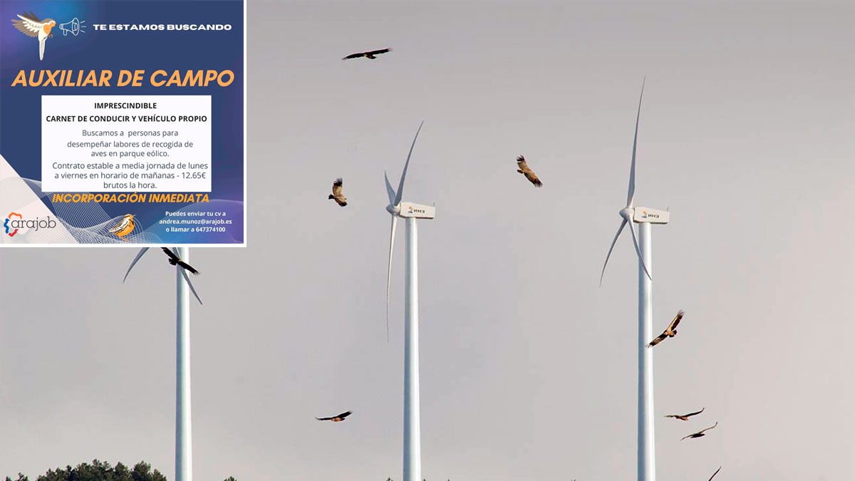Pero si atendemos a la oferta de empleo en la que buscaban candidatos/as acostumbrados/as al trabajo en campo para uno de nuestros clientes dedicado al sector medioambiental, concretamente personal para el centro de Tauste y para Plaza, en Zaragoza, nos preguntamos cuál será el impacto real de estas instalaciones en la avifauna local y migratoria si se precisa una persona a algo más de media jornada (25 horas semanales) para las siguientes funciones: