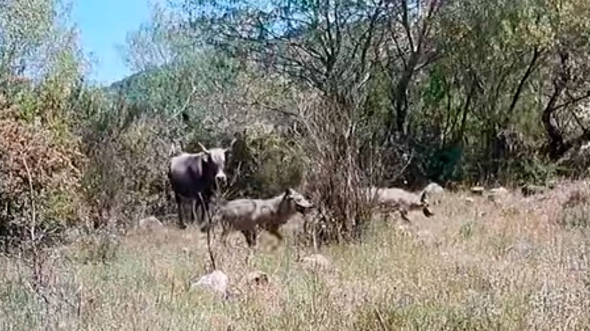 Las imágenes que vamos a ver hoy nos llevan a una interacción entre depredadores y ganado doméstico. Dos lobos avanzan por un monte en el que pastan las vacas. La noticia no está ahí, sino en que ni siquiera miran hacia el ganado, que reacciona de una manera muy defensiva que consigue que los depredadores aceleren su trote para alejarse de las grandes vacas.
