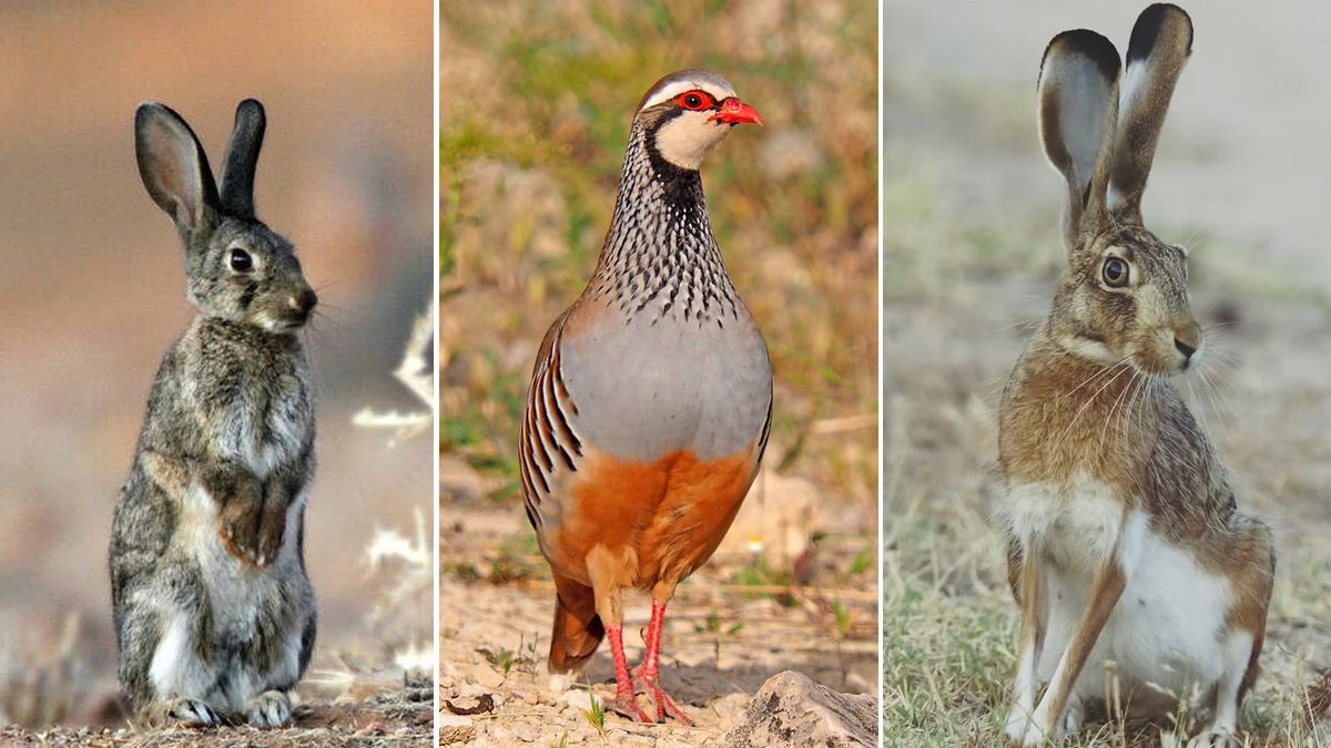 Un cazador se ve obligado a ralentizar la marcha del vehículo para no atropellar a las perdices rojas y conejos que se cruzan en su camino.