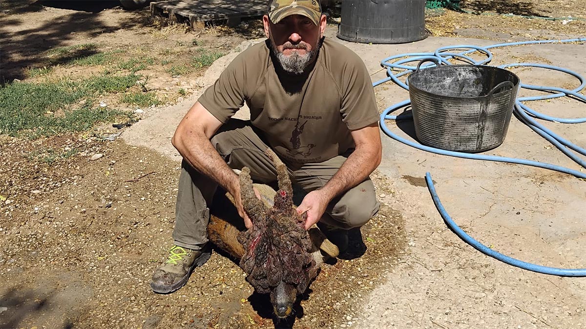 Mientras el cazador y su tío caminaban por uno de los cortafuegos, oyeron a los perros ladrando de parada en una hondonada. El sonido de las ladras no era el habitual, lo que puso en alerta a los podenqueros. Ante la insistencia de los canes, Emilio penetró en la espesura para acceder al lugar en que estaban los perros.