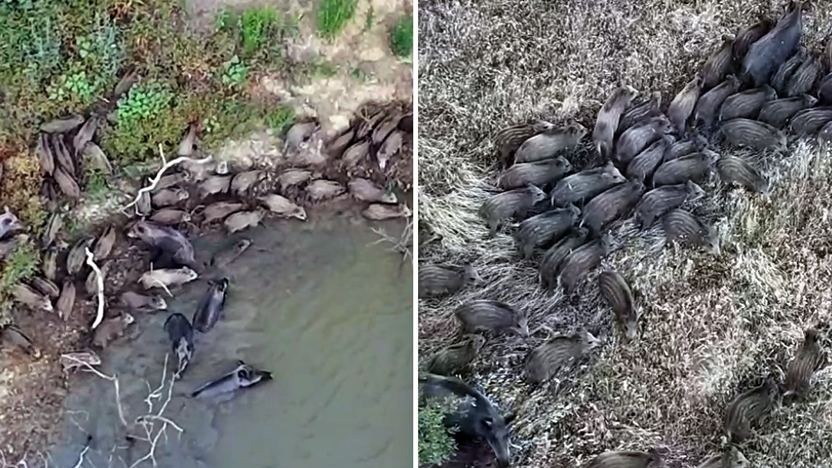 Esta misma piara, compuesta por ejemplares de ambos sexos y de diferentes edades, también fue captada por la cámara del dispositivo aéreo no tripulado en un campo de cereal próximo al punto de agua.