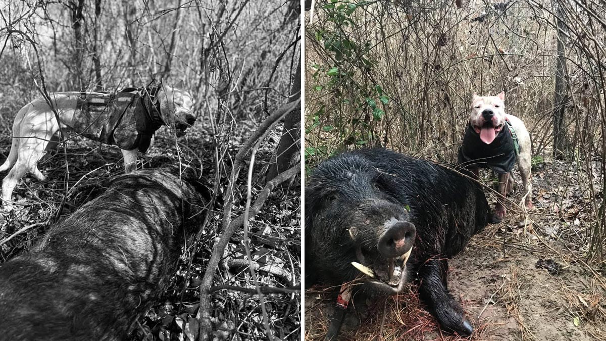 Aiyana, una hembra criada por el propietario del afijo Dogo Breeders Circle S Kennel, con sede en Heber Springs, ciudad ubicada en el condado de Cleburne, en el estado estadounidense de Arkansas, protagoniza este espectacular lance. El cazador ha incorporado a su equipo de caza un dron para seguir las evoluciones de su recova de perros. El dispositivo inmortaliza el desarrollo de la cacería. Varios perros de rastro paran al cochino, pero no se atreven a agarrarlo. Aparece en escena el dogo argentino.