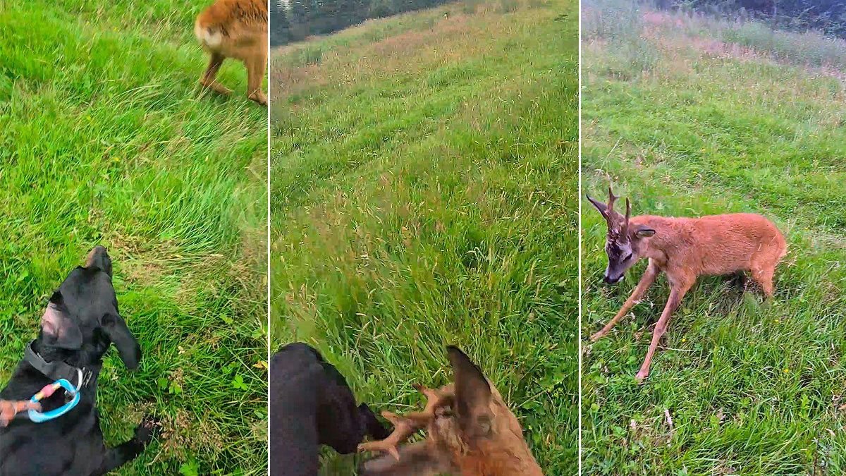 Un corzo macho ataca brutalmente a un perro que paseaba de la correa con su propietario