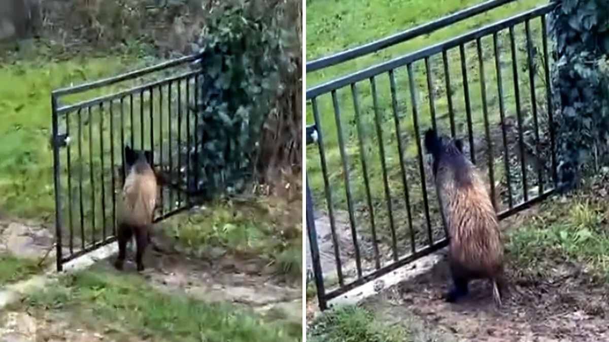 Un cochino de gran tamaño ha quedado preso entre los barrotes de la puerta de una casa rural. En su intento de penetrar en la casa, resulta aprisionado por la jeta. Al tratar de escapar, es capaz de abrir la verja.