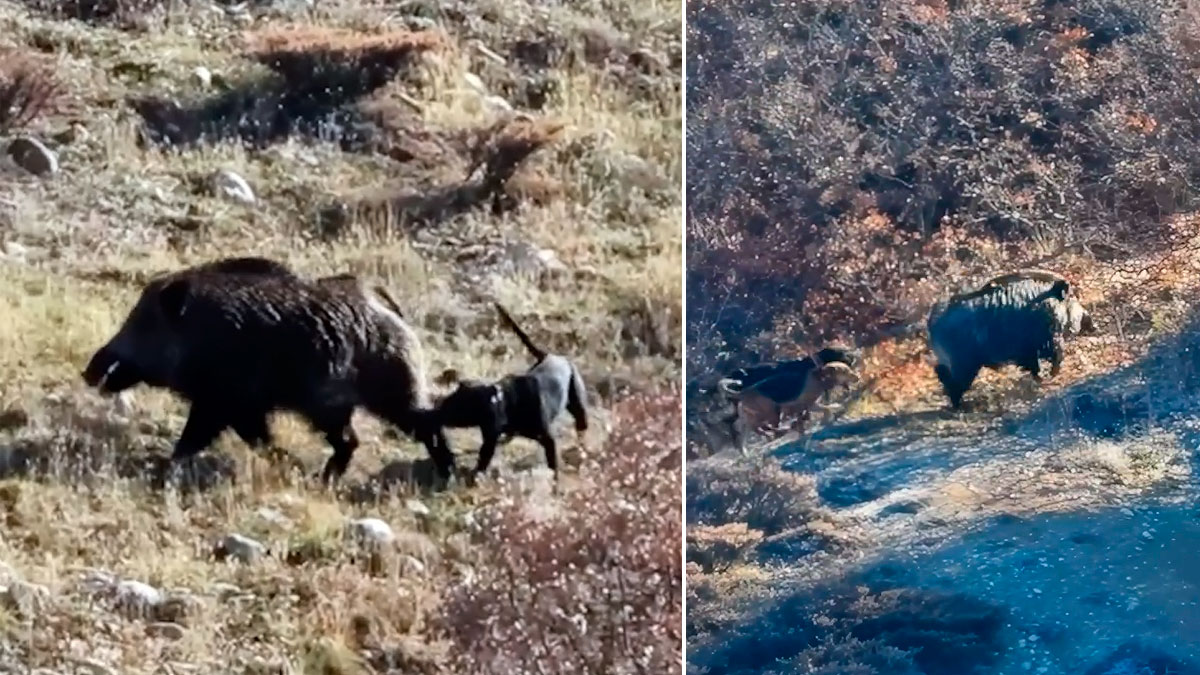 Esto nos lleva a poder aproximar el descomunal tamaño de este jabalí, que con solo girarse consigue que los perros se alejen varios metros, en una actitud idónea en este tipo de canes de caza, cuya labor pasa por descubrir y seguir los rastros de los suidos para, a continuación, acosarlos para conducirlos hasta los cazadores apostados. En ningún momento deben entrar al agarre.