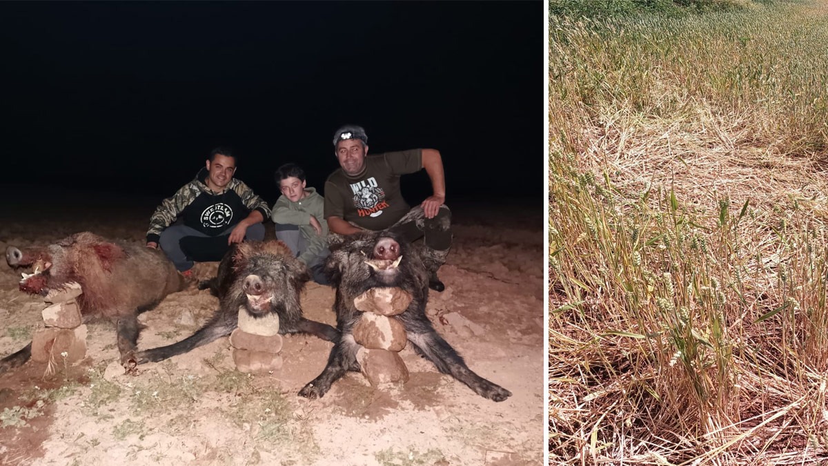 La jornada por control de daños a la agricultura ha tenido lugar en una parcela de su propiedad y en las de otros agricultores. El riojano, acompañado de su hijo Juan, se colocó en una parte del cereal con grandes daños, mientras que Samuel eligió como apostadero otra siembra también afectada por los cochinos.