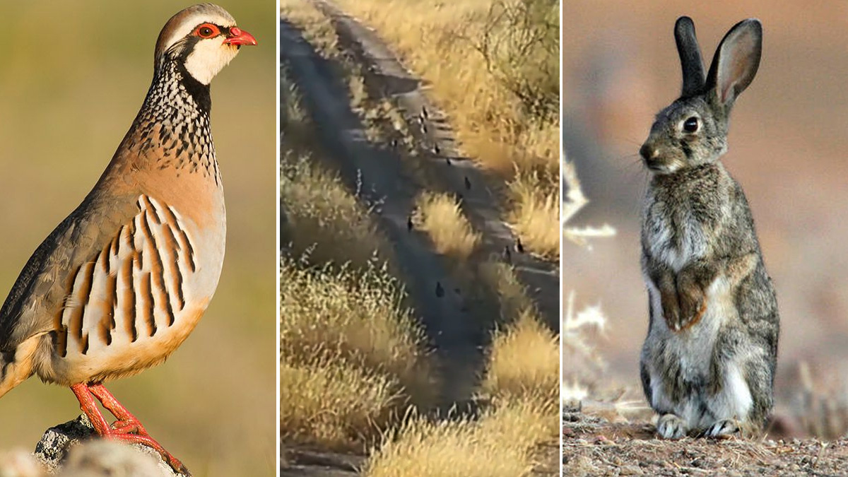 Decenas de perdices rojas y conejos acuden a los carriles de un acotado para alimentarse del grano que les proporcionan los cazadores