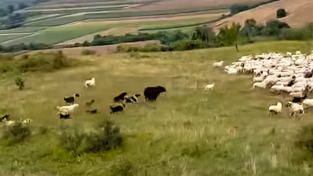 Ni los gritos del pastor, ni los fuertes silbidos, ni siquiera los ladridos de la docena de perros conductores y protectores del ganado que intentan valientemente evitarlo. El oso les planta cara y se enfrenta a todos para conseguir que retrocedan y así obtiene el tiempo necesario para alcanzar a las ovejas. Cuando lo hace, derriba a una de ellas con suma facilidad.