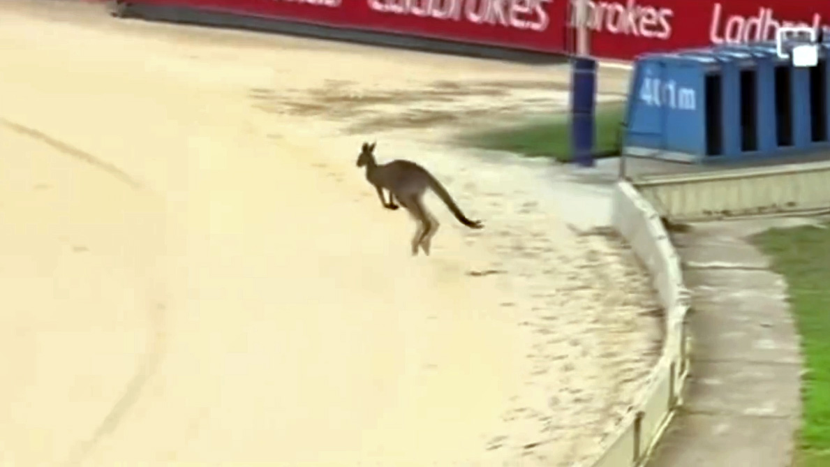 Cuando está a punto de comenzar una carrera en la que participan galgos ingleses, aparece en escena un canguro en la pista. El galgo inglés es la raza de perro más veloz del mundo. Es capaz de superar los 70 km/h.